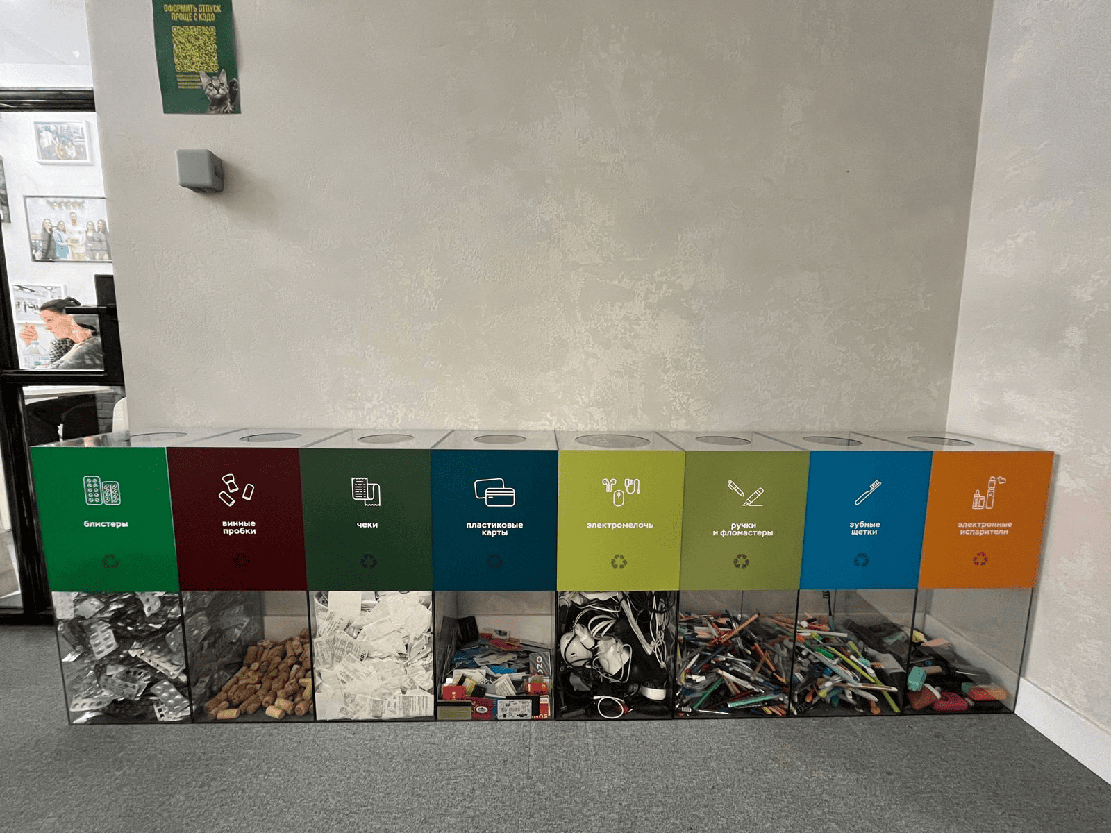 Расположение. Контейнеры размещаются в местах с высокой проходимостью (у кофе-поинтов, лифтов, в зонах отдыха) и там, где накапливается основное количество того или иного вида отходов (например, рядом с принтером — для бумаги и картриджей).